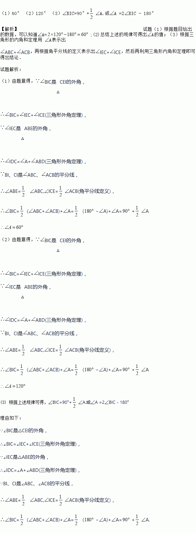 (3)请你用数学表达式归纳出∠BIC与∠A的关系式,并说明理由。