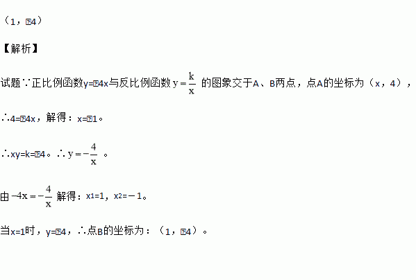 已知正比例函数y=﹣4x与反比例函数的图象交于A、B两点,若点A的坐标为(x,4),则点B的坐标为 .