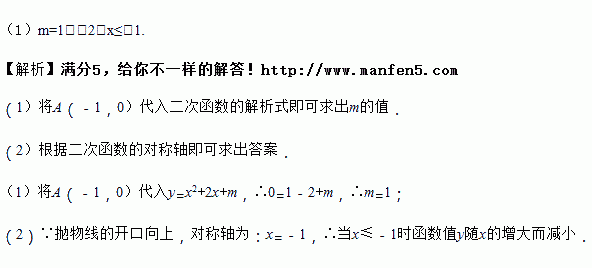 已知二次函数y=x2+2x+m的图象过点A(﹣1,0).