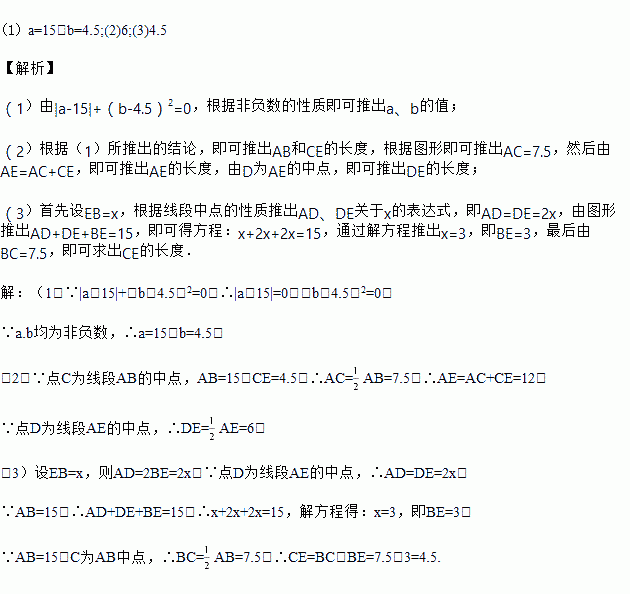 (1)若线段AB=a,CE=b,|a﹣15|+(b﹣4.5)2=0,求a,b的值;