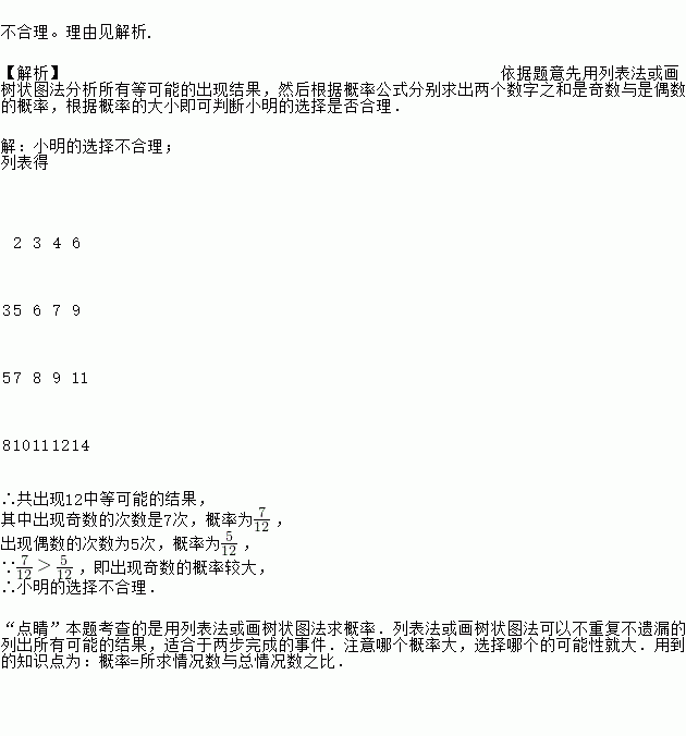 小明的选择合理吗?从概率的角度进行分析(要求用树状图或列表方法求解)