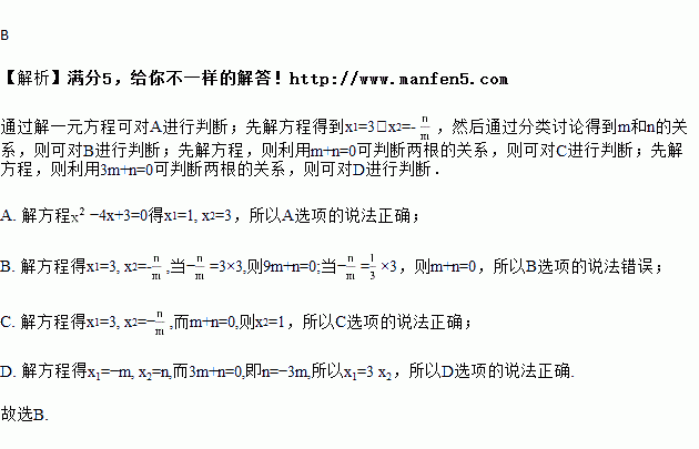 C. 若m+n=0且m≠0,则关于x的方程(x﹣3)(mx+n)=0是3倍根方程