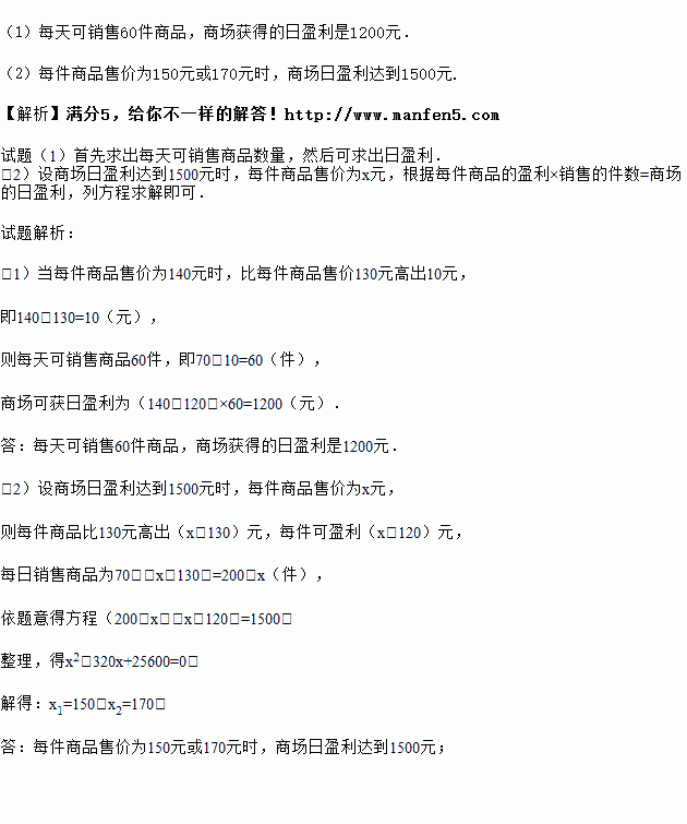 (1)当每件商品售价定为140元时,每天可销售多少件商品?商场获得的日盈利是多少?