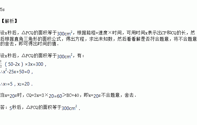 如图,在△ABC中,AC=50 cm,BC=40 cm,∠C=90°,点P从点A开始沿AC边向点C以2 cm/s的速度匀速移动,同时另一点Q从点C开始以3 cm/s的速度沿着射线CB匀速移动,当△PCQ的面积等于300 cm2时,运动时间为__________.