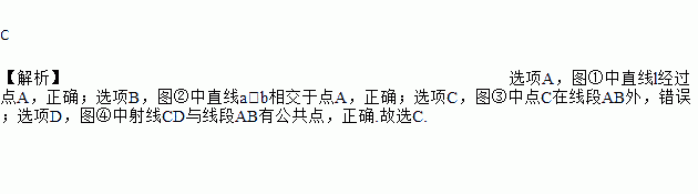 C. 图③中点C在线段AB上 D. 图④中射线CD与线段AB有公共点