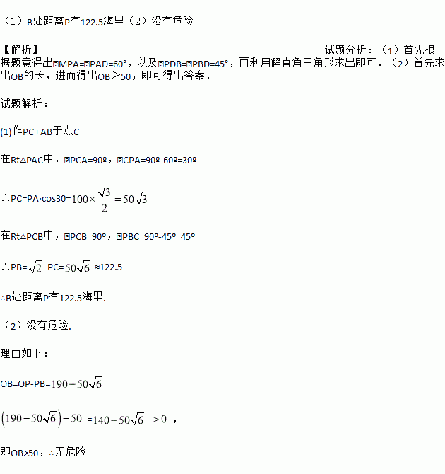 (2)假设有一圆形暗礁区域,它的圆心位于射线PB上,距离灯塔190海里的点O处.圆形暗礁区域的半径为50海里,进入这个区域,就有触礁的危险.请判断海轮到达B处是否有触礁的危险,并说明理由.