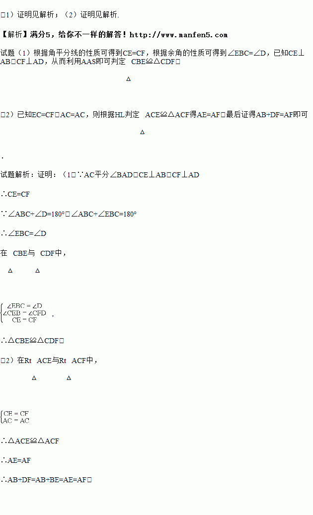 四边形ABCD中,∠ABC+∠D=180°,AC平分∠BAD,CE⊥AB于E,CF⊥AD于F.