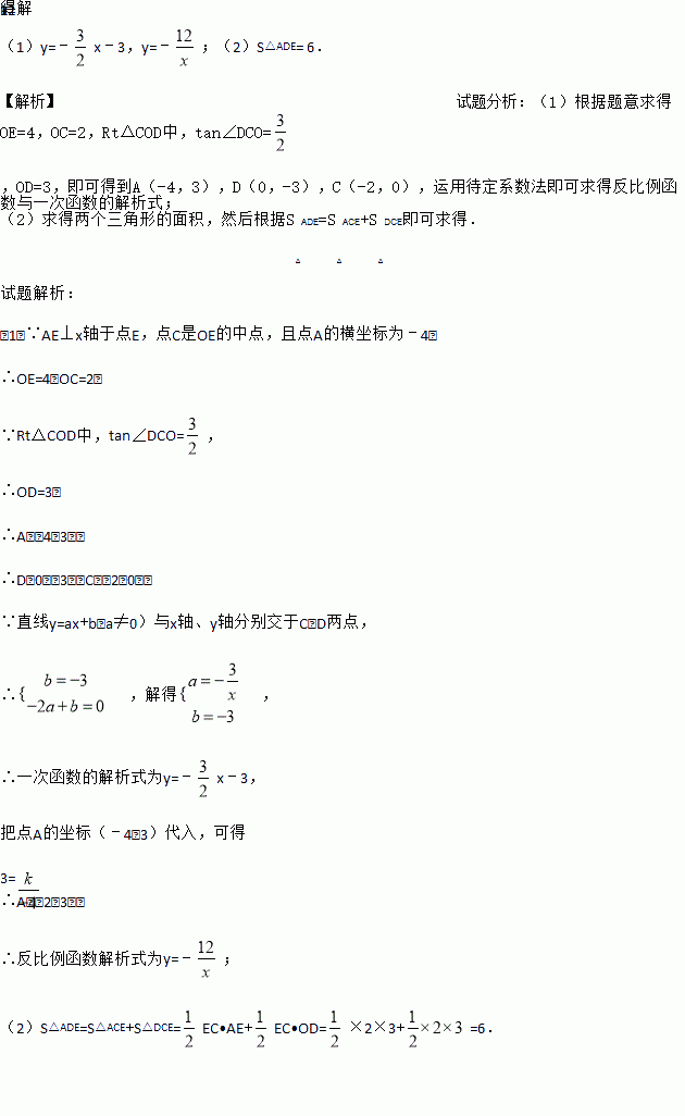 (k≠0)的图象相交于A,B两点,与x轴,y轴分别交于C,D两点,tan∠DCO=