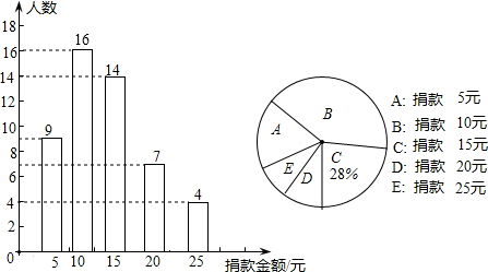 分析:(1)用捐款15元的人数14除以所占的百分比28%,计算即可得解;