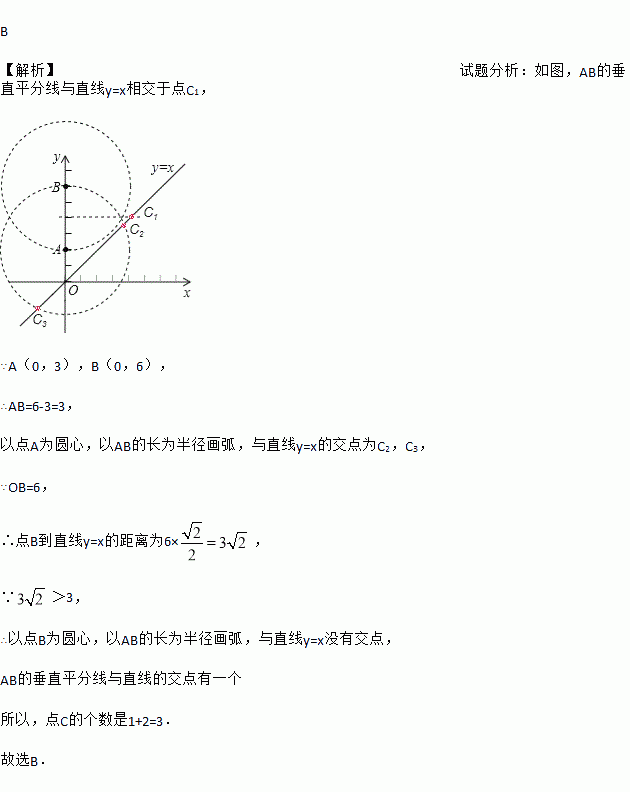 如图,在平面直角坐标系xOy中,A(0,2),B(0,6),动点C在直线y=x上.若以A、B、C三点为顶点的三角形是等腰三角形,则点C的个数是