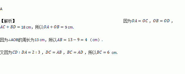 如图,在平行四边形ABCD中,对角线AC、BD相交于点O,若BD、AC的和为18cm,CD:DA=2:3,△AOB的周长为13cm,那么BC的长是( )