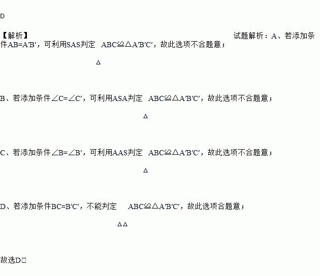 D. 若添加条件BC=B′C′,则△ABC与△A′B′C′全等