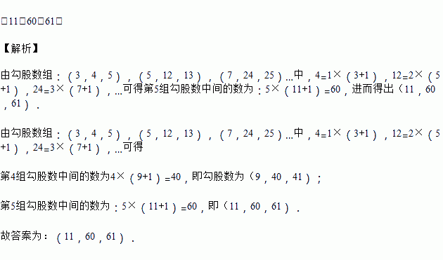 勾股定理a2+b2=c2本身就是一个关于a,b,c的方程,满足这个方程的正整数解(a,b,c)通常叫做勾股数组.毕达哥拉斯学派提出了一个构造勾股数组的公式,根据该公式可以构造出如下勾股数组:(3,4,5),(5,12,13),(7,24,25),….分析上面勾股数组可以发现,4=1×(3+1),12=2×(5+1),24=3×(7+1),…分析上面规律,第5个勾股数组为_____.