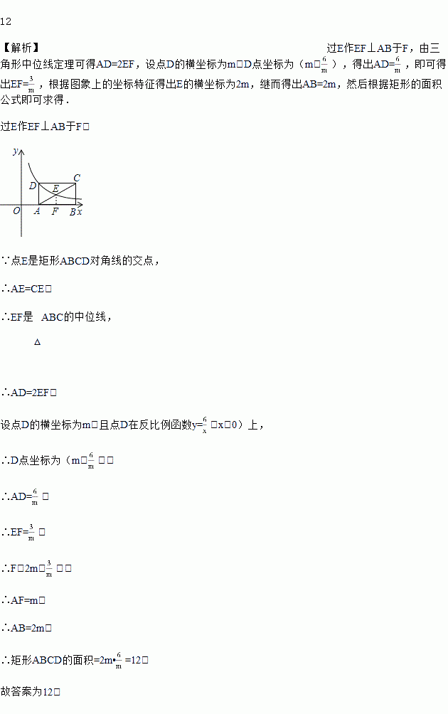 如图,矩形ABCD中,E是AC的中点,点A、B在x轴上.若函数(x>0) 的图像过D、E两点,则矩形ABCD的面积为________.