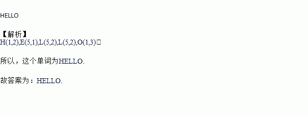 如图,O对应的有序数对为(1,3)有一个英文单词的字母顺序对应如图中的有序数对分别为(1,2),(5,1),(5,2),(5,2),(1,3),请你把这个英文单词写出来或者翻译成中文为________.