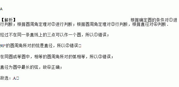 下列说法:①经过三点可以作一个圆;②90°的角所对的弦是直径;③相等的圆周角所对的弧相等;④直径是圆中最长的弦.其中正确的说法有( )