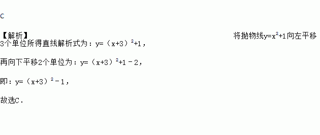 C 【解析】将抛物线y=x2+1向左平移3个单位所得直线解析式为:y=(x+3)2+1, 再向下平移2个单位为:y=(x+3)2+1﹣2, 即:y=(x+3)2﹣1, 故选C.