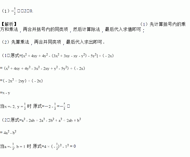 (1)先化简,再求值: [(x+2y)2-(3x-y)(x+y)-5y2]÷(-2x),其中x=-2,y=.