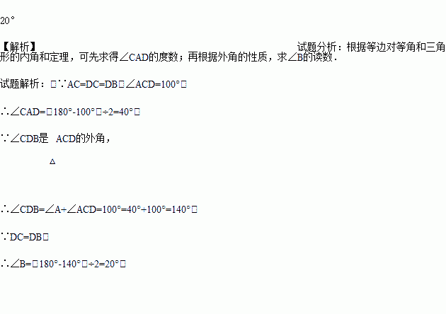 在△ABC中,AC=DC=DB,∠ACD=100°,求∠B的度数