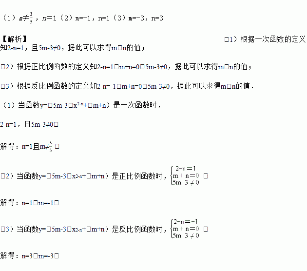 已知y关于x的函数y=(5m-3)x2-n+(m+n).