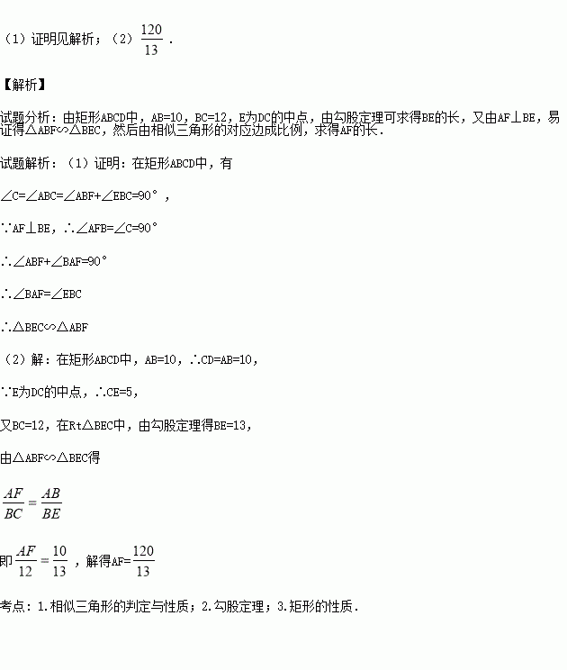 在矩形ABCD中,AB=10,BC=12,E为DC的中点,连接BE,作AF⊥BE,垂足为F.