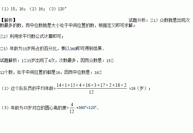 (3)若把这个队队员年龄绘成扇形统计图,请求出年龄为15岁对应的圆心角的度数.