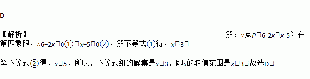 D 【解析】【解析】 ∵点P(6-2x,x-5)在第四象限,∴6?2x>0①,x?5<0②,解不等式①得,x<3; 解不等式②得,x<5,所以,不等式组的解集是x<3,即x的取值范围是x<3.故选D.