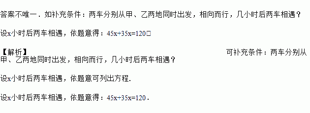 某校七年级的一名学生做作业时,不慎将墨水瓶打翻,使一道题只看到如下字样:“甲、乙两地相距120千米”,摩托车的速度为45千米/时,运货汽车的速度为35千米/时,