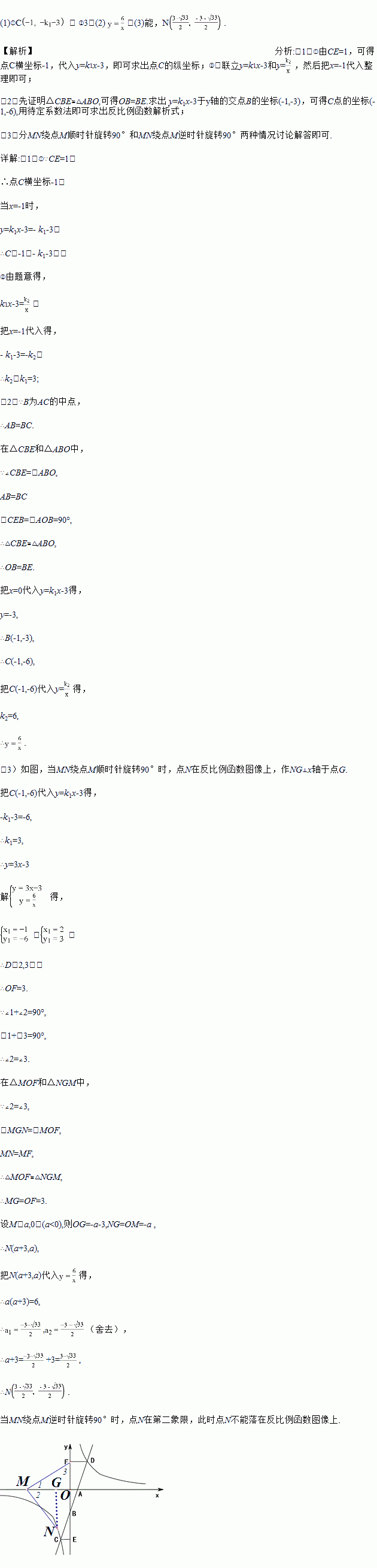 (3) 在(2)的条件下,设点M是x轴负半轴上一点,将线段MF绕点M按顺时针或逆时针方向旋转90°得到线段MN,当点M滑动时,点N能否在反比例函数的图象上?如果能,求出点N的坐标;如果不能,请说明理由.