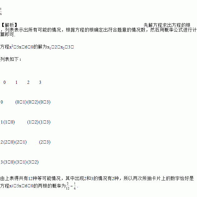 有四张质地相同并标有数字0,1,2,3的卡片(如图所示),将卡片洗匀后,背面朝上放在桌面上,第一次任意抽取一张(不放回),第二次再抽一张.用列表法或画树状图法求两次所抽卡片上的数字恰好是方程x2-5x+6=0的两根的概率.