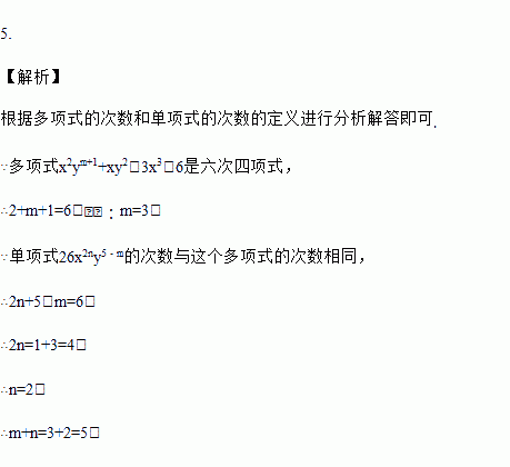 已知多项式x2ym+1+xy2–3x3–6是六次四项式,单项式6x2ny5–m的次数与这个多项式的次数相同,求m+n的值.