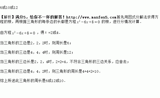 三角形的每条边的长都是方程的根,则三角形的周长是 .