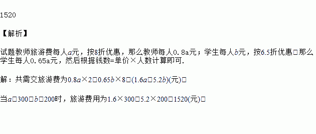 暑假期间2名教师带8名学生外出旅游,教师旅游费每人a元,学生每人b元,因是团体予以优惠,教师按8折优惠,学生按6.5折优惠,则共需交旅游费多少元(用含字母的式子表示)?并计算当a=300,b=200时的旅游费用.