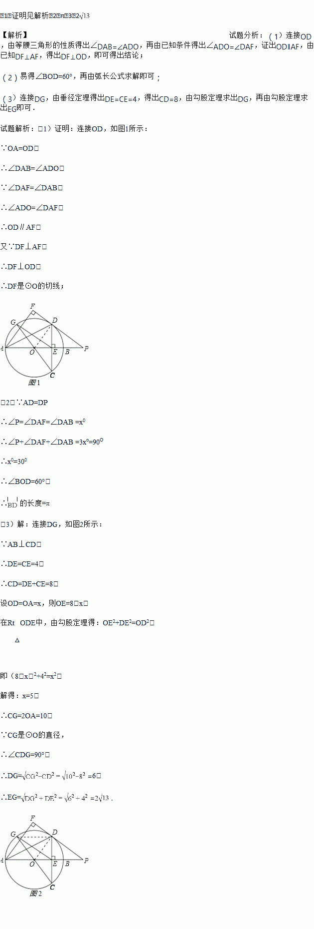 如图,在⊙O中,直径AB垂直弦CD于E,过点A作∠DAF=∠DAB,过点D作AF的垂线,垂足为F,交AB的延长线于点P,连接CO并延长交⊙O于点G,连接EG.