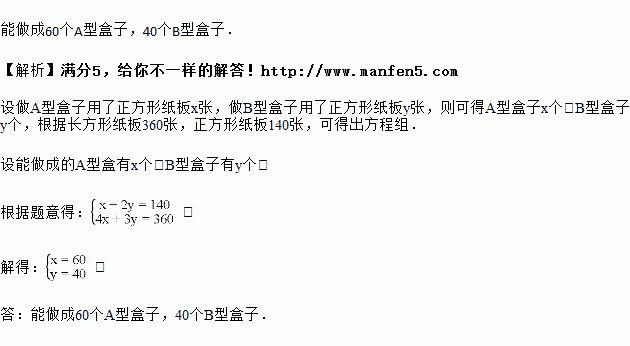 某工厂用如图1所示的长方形和正方形纸板做成如图2所示的A、B两种长方体形状的无盖纸盒,现有正方形纸板140张,长方形纸板360张,刚好全部用完,问能做成多少个A型盒子?多少个B型盒子?