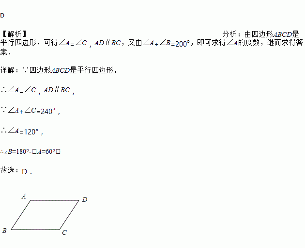 已知平行四边形 ABCD中,∠A+∠C=240°,则的度数为( )