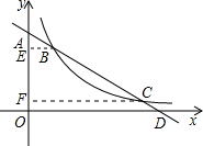 分析:先求出直线与x轴和y轴的两交点D与A的坐标,根据OA与OD的长度求出比值即可得到角ADO的正切值,利用特殊角的三角函数值即可求出角ADO的度数,然后过B和C分别作y轴的垂线,分别交于E和F点,联立直线与双曲线方程,消去y后得到关于x的一元二次方程,利用韦达定理即可表示出EB与FC的积,然后在直角三角形AEB中利用cos∠ABE表示出EB与AB的关系,同理在直角三角形AFC中,利用cos∠ACF表示出FC与AC的关系,根据AB•AC=4列出关于k的方程,求出方程的解即可得到k的值.
