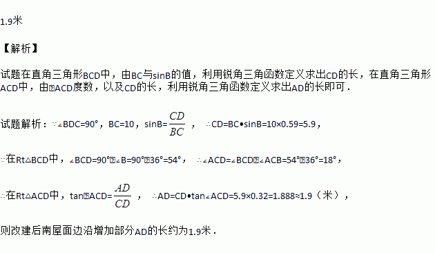 太阳能光伏建筑是现代绿色环保建筑之一,老张准备把自家屋顶改建成光伏瓦面,改建前屋顶截面△ABC如图2所示,BC=10米,∠ABC=∠ACB=36°,改建后顶点D在BA的延长线上,且∠BDC=90°,求改建后南屋面边沿增加部分AD的长.(结果精确到0.1米)