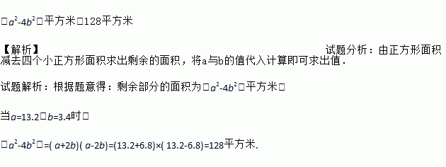 如图,在一块边长为a米的正方形空地的四角均留出一块边长为b(b<)米的正方形修建花坛,其余的地方种植草坪.利用因式分解计算当a=13.2,b=3.4时,草坪的面积.