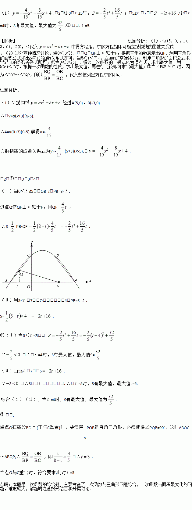 (2)过C作CD∥x轴交抛物线于D, 连续BC、AD,两个动点P、Q分别从A、B两点同时出发,都以每秒1个单位长度的速度运动.其中,点P沿着线段AB向B点运动,点Q沿着折线B→C→D的路线向D点运动.设这两个动点运动的时间为