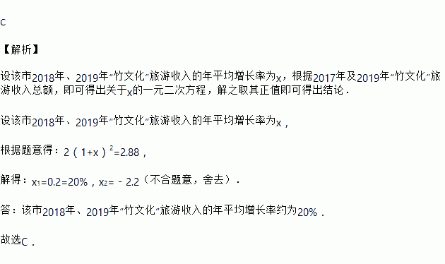 某市从2017年开始大力发展“竹文化”旅游产业.据统计,该市2017年“竹文化”旅游收入约为2亿元.预计2019“竹文化”旅游收入达到2.88亿元,据此估计该市2018年、2019年“竹文化”旅游收入的年平均增长率约为( )