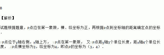 已知点P位于轴右侧,距轴3个单位长度,位于轴上方,距离轴4个单位长度,则点P坐标是( )