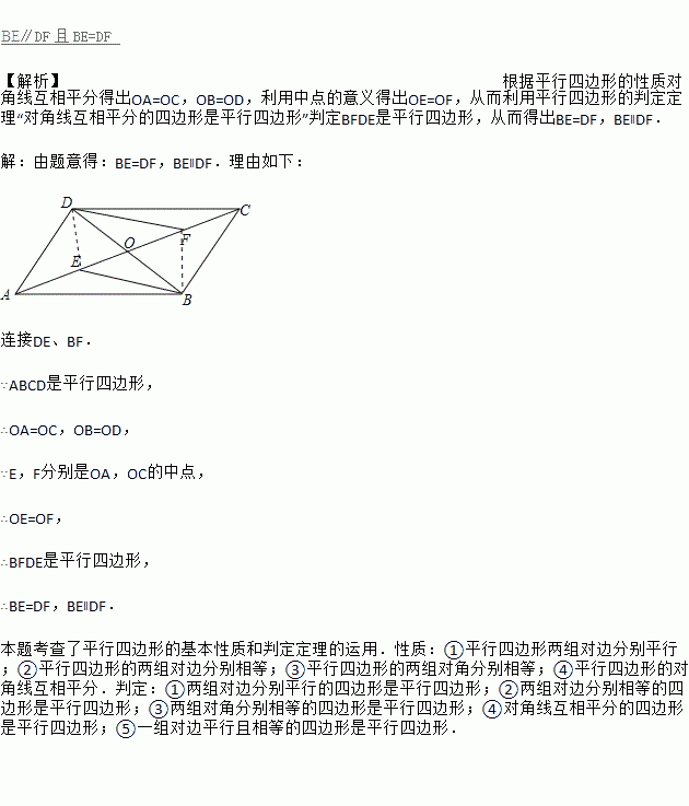 如图,在□ABCD中,AC交BD于点O,点E、点F分别是OA、OC的中点,请判断线段BE、DF的关系,并证明你的结论![]()