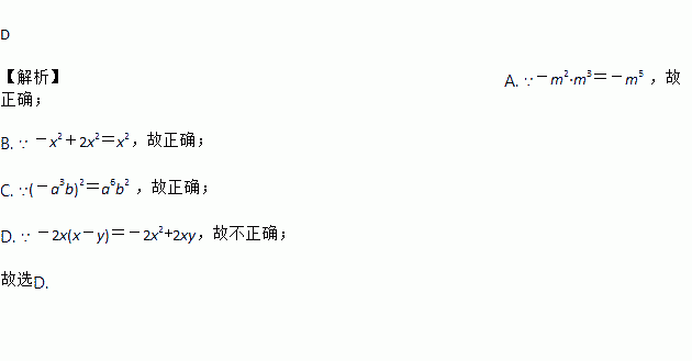 D 【解析】A. ∵-m2·m3=-m5 ,故正确; B. ∵ -x2+2x2=x2,故正确; C. ∵(-a3b)2=a6b2 ,故正确; D. ∵ -2x(x-y)=-2x2+2xy,故不正确; 故选D.