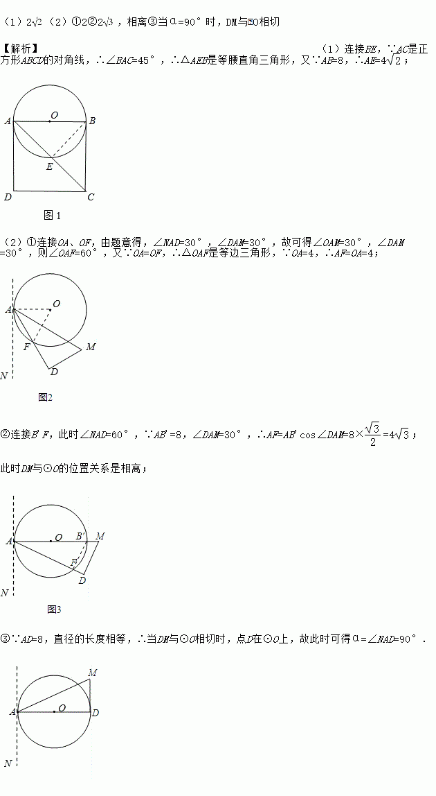②当α=60°时,求出线段AF的长;判断此时DM与⊙O的位置关系,并说明理由;