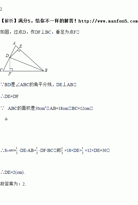 如图,BD是∠ABC的角平分线,DE⊥AB于E,△ABC的面积是30cm2,AB=14cm,BC=16cm,则DE=_____cm.