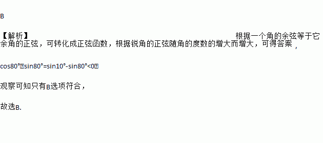 B 【解析】根据一个角的余弦等于它余角的正弦,可转化成正弦函数,根据锐角的正弦随角的度数的增大而增大,可得答案, cos80°﹣sin80°=sin10°-sin80°<0, 观察可知只有B选项符合, 故选B.