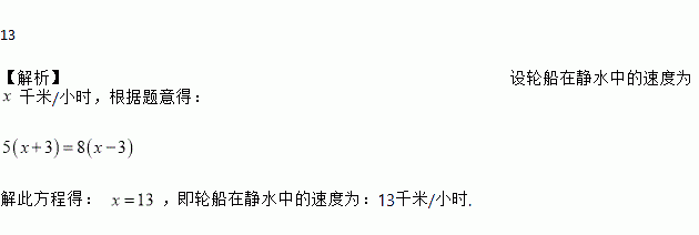 13 【解析】设轮船在静水中的速度为千米/小时,根据题意得: 解此方程得: ,即轮船在静水中的速度为:13千米/小时.