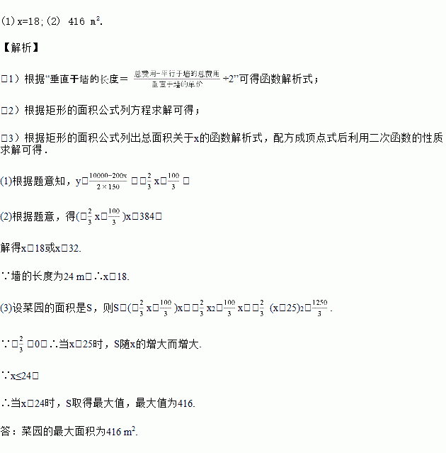 投资1万元围一个矩形菜园(如图),其中一边靠墙,另外三边选用不同材料建造.墙长24 m,平行于墙的边的费用为200元/m,垂直于墙的边的费用为150元/m,设平行于墙的边长为x m.