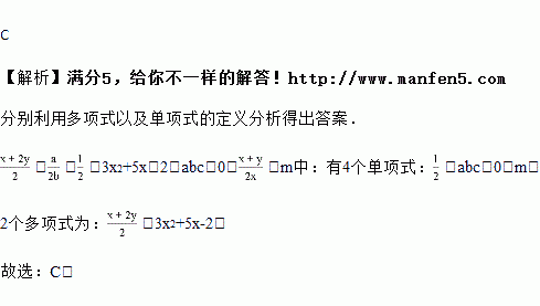 A. 有5个单项式,1个多项式 B. 有3个单项式,2个多项式